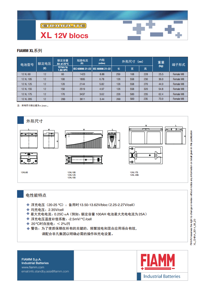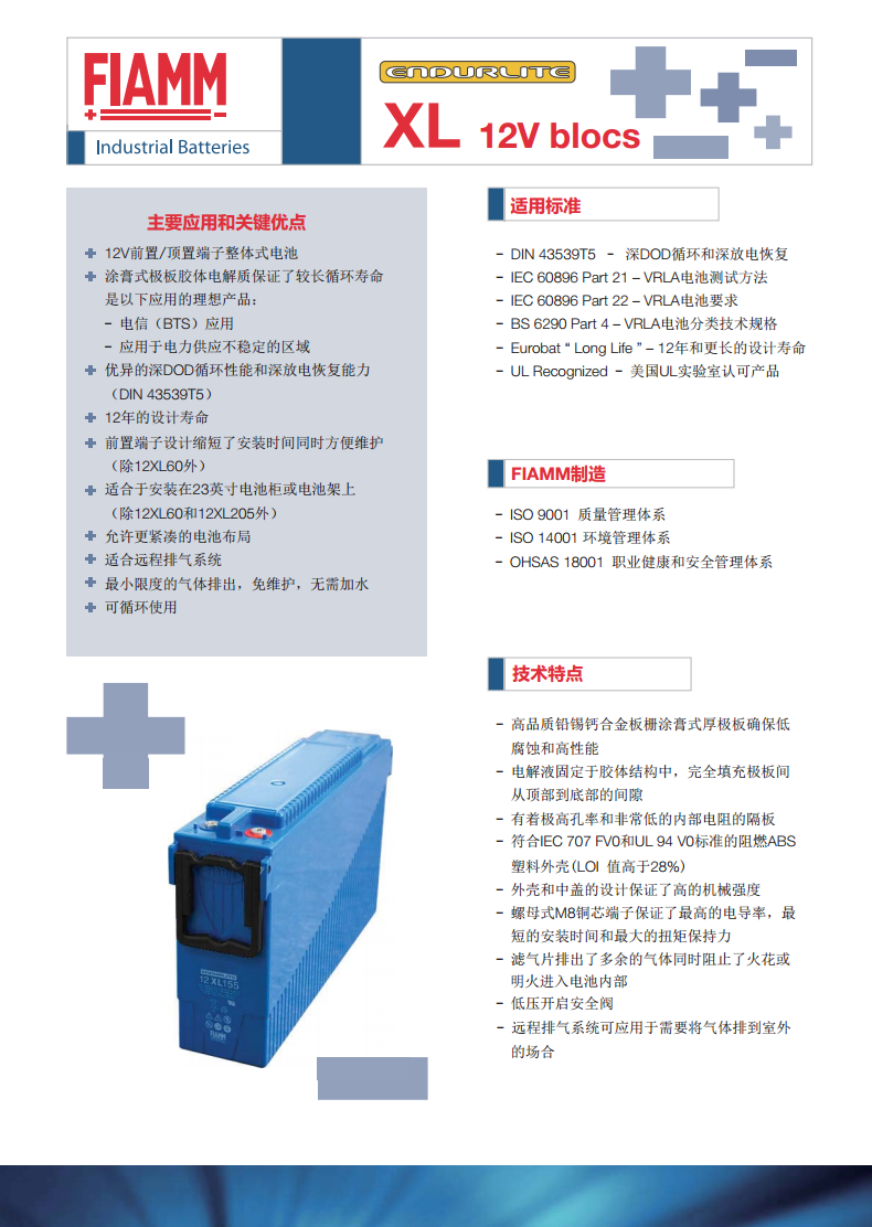 非凡蓄电池SLA系列:FIAMM AGM 2V 单体电池和 6V 整体式电池, 100Ah 到 2000Ah,专为最高的完整性、安全性和可靠而设计 是以下应用的理想产品: • 高倍率放电UPS应用• 电信无线和有线• 工业和程序控制• 应急电源供应系统• IT网络操作和数据中心 • 电气设施• 开关设备 优异的高倍率放电性能(1到60分钟)并适合中到较长时间的放电(2至20小时)、6V 整体式电池:12年设计寿命 / 2V 单体电池:>15年设计寿命在温度受控的环境浮充使用、非常高的能量密度允许更紧凑的电池布局、阻燃ABS塑料外壳和回火保护装置、完全符合国际产品和安全规范、VRLA AGM电池技术和内部气体再复合效率达99%、无需单独的电池间、免维护无需加水、对于航空/海洋/铁路/公路运输均无危害(除2SLA800-2000:对铁路/公路运输无危害)、100%可回收利用。